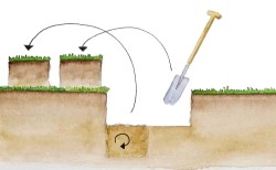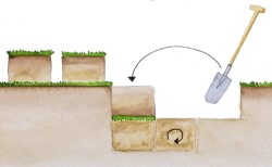 Wende nun die nächste Reihe Oberboden und lege diese auf den umgegrabenen Unterboden. Danach wird die nächste Reihe Unterboden umgegraben