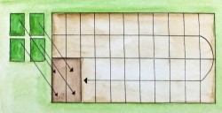 Teile die umzugrabende Fläche in zwei Hälften ein und arbeite dich in Pfeilrichtung vor und wieder zurück. So kann der seitlich gelagerte Oberboden leichter in die letzte Furche eingefüllt werden und muss nicht erst zum anderen Ende der Fläche transportiert werden.