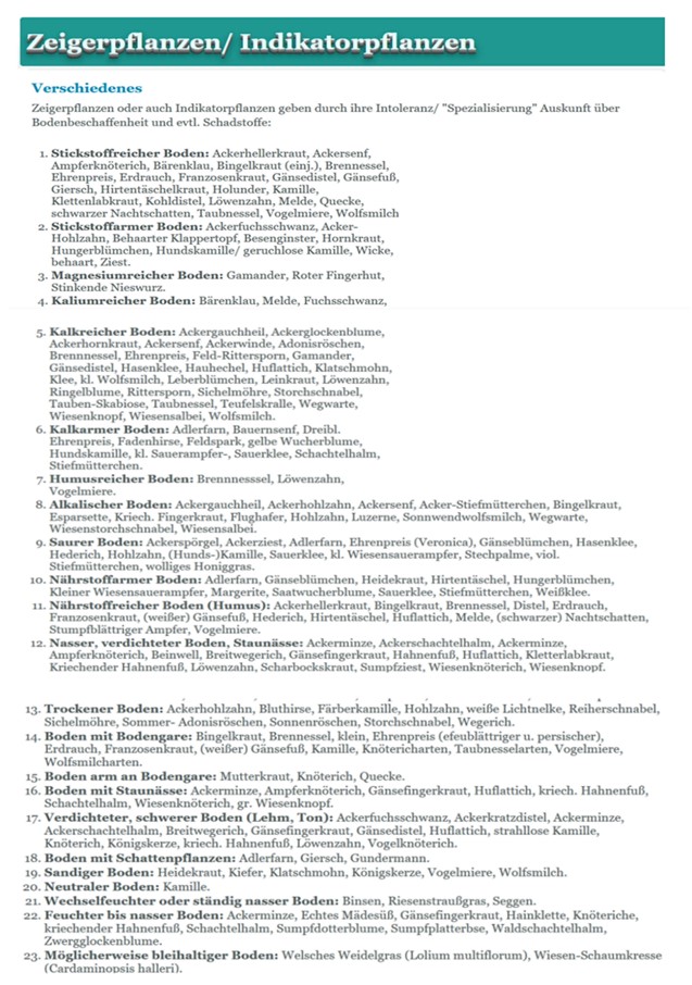 Jeder Gartenfreund, der einen Garten übernimmt, sollte eine Bodenprobe ziehen und untersuchen lassen (LVA oder LUFA). Wer keine Bodenprobe untersuchen lassen möchte, sollte die Wildkräuter die in seinem Garten wachsen, genau beobachten.  Zeigerpflanzen oder auch Indikatorpflanzen geben durch ihre Intoleranz/“Spezialisierung“ Auskunft über Bodenbeschaffenheit und evtl. Schadstoffe. Eine Zeigerpflanze allein sagt  über einen Bodenzustand nichts aus. Zeigerpflanzen müssen immer zu mehreren / Gruppen auftreten um Rückschlüsse auf den Bodenzustand Art des Bodens (Lehm,Ton usw.) Humusgehalt und Gare sowie PH_Wert zu ermöglichen.  Diese „Unkräuter“ wachsen nur dort, wo sie Bedingungen vorfinden, die ihnen behagen. Jeder Gärtner hat also das „Unkraut“ das er verdient. Wildkräuter verbergen mehr als ihr bescheidenes Aussehen ahnen