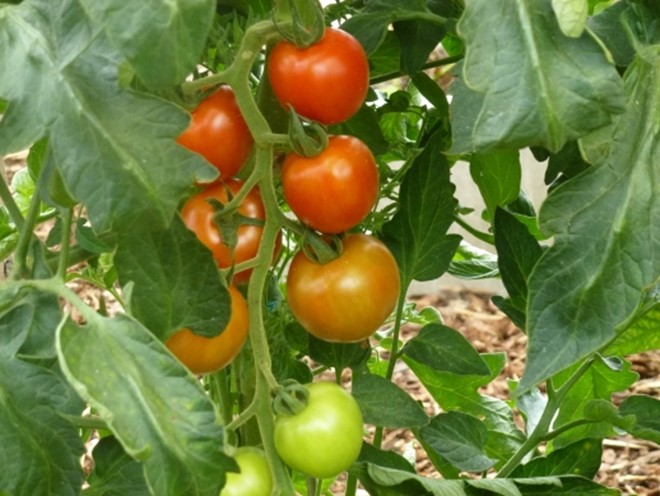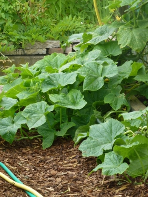 Gurken auf Rindenmulch, nur Blätter und Früchte, die Pflanzen stehen in normaler Erde mit Kompost.