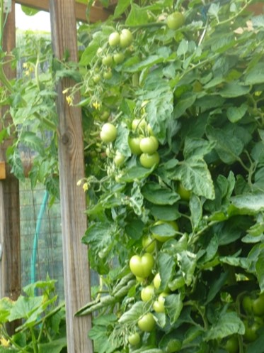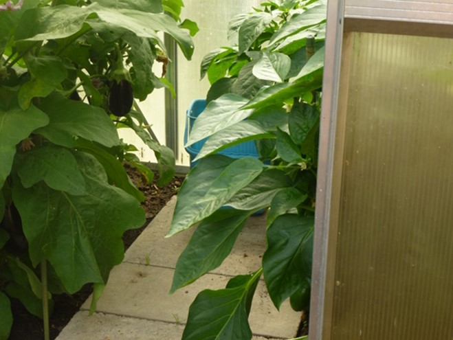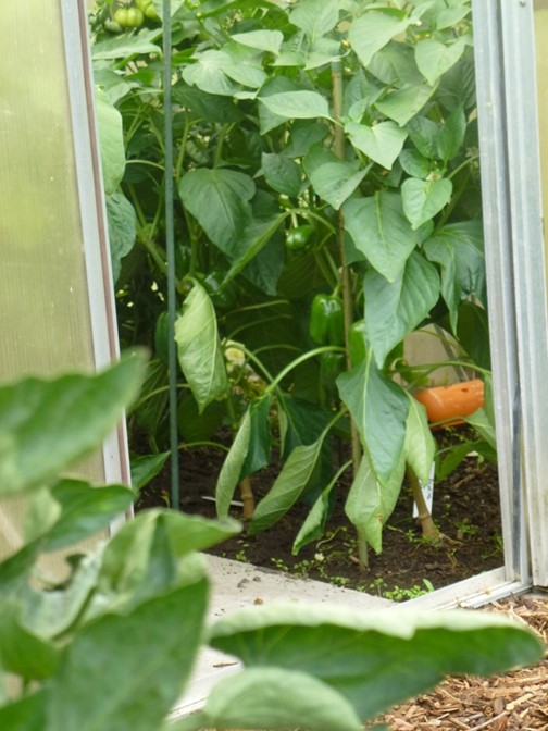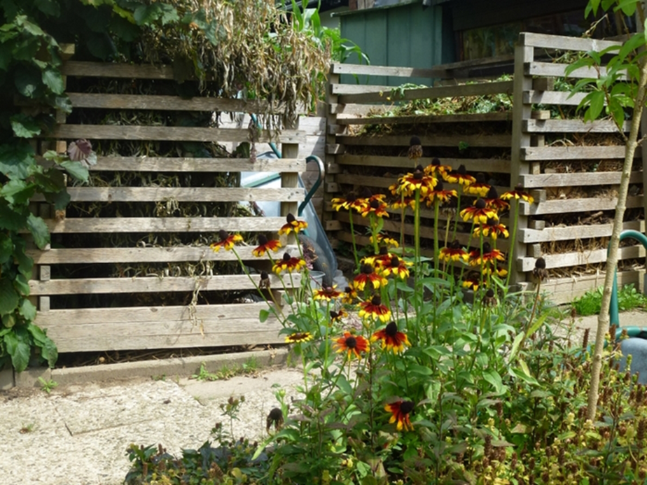 Seite mit hohen einjährigen Pflanzen. Wir „Ernten“ pro Jahr etwa 1 cbm.Kompost. Im Herbst streuen wir auf die freien Beete und den Baumscheiben Frischkompost oder angerotteten Mist als Mulchdecke, die im Frühjahr, je nach Verrottungszustand eingearbeitet oder wieder auf den Kompost wandert.