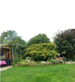 Rasen 40 m² mit Laube, Kiwi und Kletterhortensie Bluthasel am Kompost