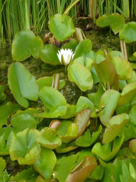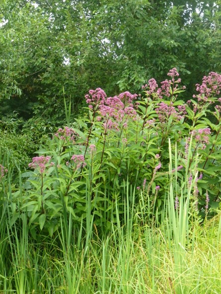 Teichanlage mit Aruncus Silvestre, Wasserdost, Binsen, Rohrkolben und Seerosen