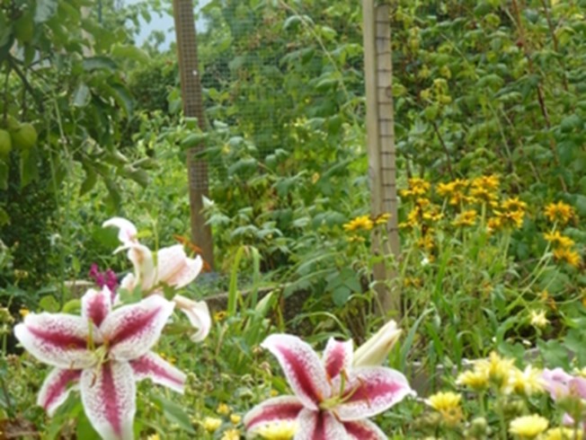 Himbeeren, im Vordergrund Lilien, hohe Tagetes, Sonnenhut und einährige Sommerblumen