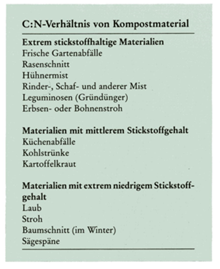 dessen Zerrkleinerungsgrad, vom Luft – und Wassergehalt, von den Außentemperaturen, aber auch von den äußeren Eingriffen in den Komposthaufen. Zum Beispiel Kompoststarter in Form von Stickstoffhaltigen Kräutern, Brenessel und deren Jauche, reinen Stickstoff – Blut-und Knochenmehl, käufliche Kompoststarter oder Kalkstickstoff.