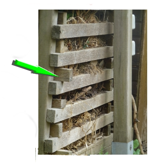 Er ist aus Holz, 2 Horden, jeweils 2,30 m lang, 1,20 m breit und 1,50 m hoch. Zwischen den Horden ein 1,00 m breiter Arbeitsplatz, zum schreddern und aussieben des Kompostes. Wir haben je Horde 4 Einschlaghülsen für 7 X 7 cm Vierkanthölzer genommen und 4 Vierkanthölzer 7 X 7 cm, 1,80 m lang, sowie 4 X 6 cm unbehandelte Dachlatten für die Zwischenräume genommen und sie so angeschraubt, dass sie auf der Seite zum Arbeitsplatz verschiebbar sind. So das sie beim befüllen nach vorne geschoben werden können und wenn der Inhalt (Volumen) abnimmt, zum entleeren, nach hinten.